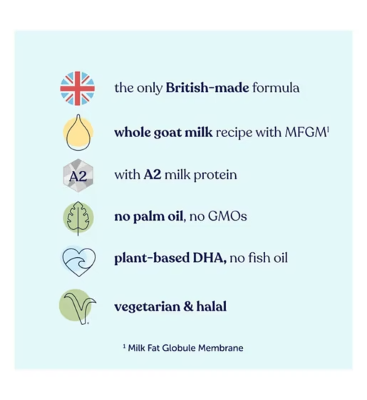 We’re 100% British and don’t do palm oil, fish oil or other cheap additives. What we do do is locally-sourced full cream A2 goat milk and goat whey, plant-based DHA and 3’-GL. Simple.