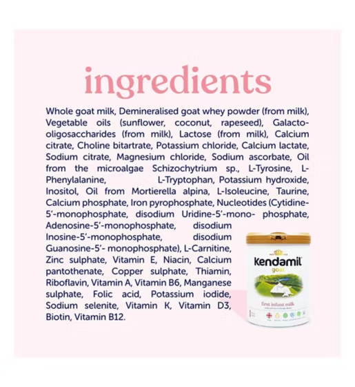 Whole Goat Milk Demineralised Goat Whey Powder (from Milk) Vegetable Oils (Sunflower, Coconut, Rapeseed) Galacto-Oligosaccharides (from Milk) Lactose (from Milk) Calcium Citrate Choline Bitartrate Potassium Chloride Calcium Lactate Sodium Citrate Magnesium Chloride Sodium Ascorbate Docosahexaenoic Acid L-Tyrosine L-Phenylalanine L-Tryptophan Potassium Hydroxide Inositol Arachidonic Acid L- Isoleucine Taurine Calcium Phosphate Nucleotides (Cytidine-5'-Monophosphate, Disodium Uridine-5'-Monophosphate, Adenosine-5'-Monophosphate, Disodium Inosine-5'-Monophosphate, Disodium Guanosine-5' Monophosphate) Iron pyrophosphate L-Carnitine Zinc Sulphate Vitamin E Niacin Calcium Pantothenate Copper Sulphate Thiamin Riboflavin Vitamin A Vitamin B6 Manganese Sulphate Folic acid Potassium Iodide Sodium Selenite Vitamin K Vitamin D3 Biotin Vitamin B12